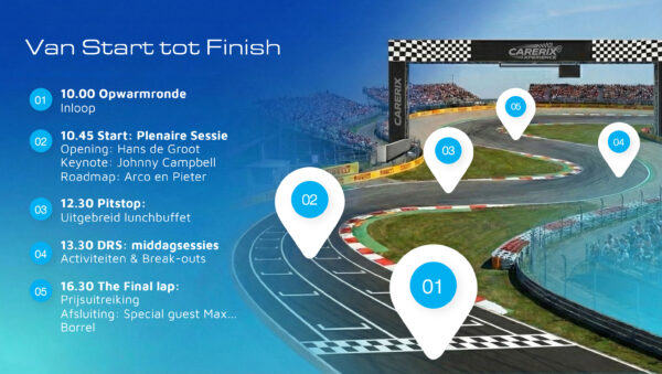 Tijdens de Carerix Xperience nemen we je mee in de wereld van high performance recruitment. We starten bij de basis van jouw pole position, waar we ontdekken waarom data de onmisbare brandstof is voor jouw succes. Vervolgens duiken we onder de motorkap om te zien hoe jouw team met de allernieuwste technologie de snelste wagen van het veld bouwt.