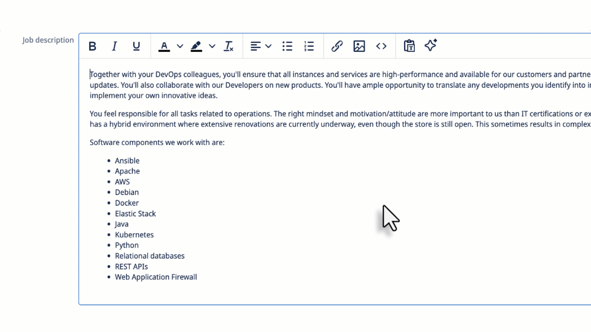 With the AI Assistant, you can rewrite job vacancy texts, check spelling, or improve the tone of voice. A quick check, a fresh perspective, or a summary in seconds. AI helps you transform existing job descriptions by optimizing them for better readability, a professional look, and attractiveness to candidates. Grammatical errors are also automatically detected and corrected, while the tone of voice is adapted to your corporate style.