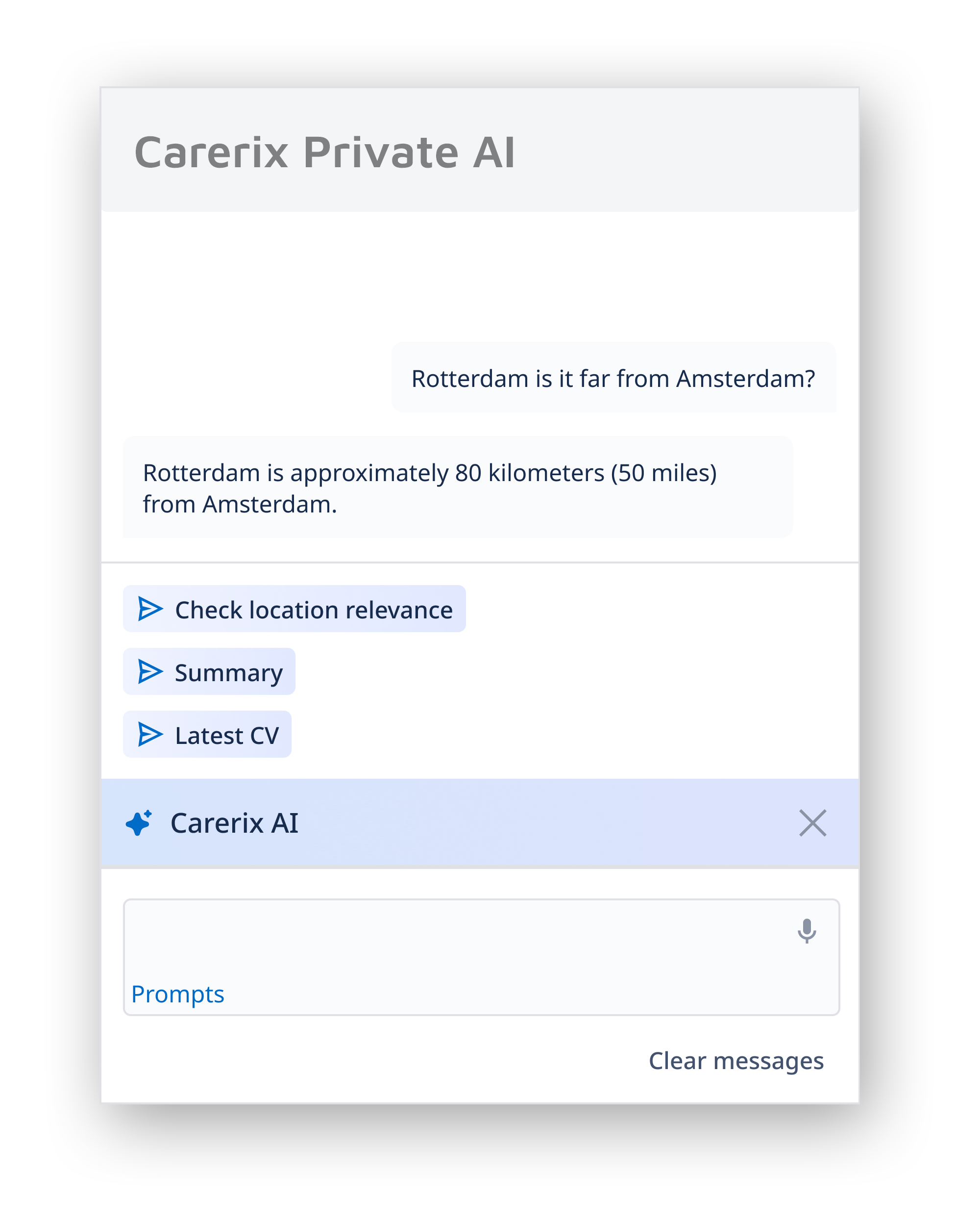 Ask questions about your candidate data and let Carerix AI do the work for you. The system searches through all available candidate information and generates relevant answers and documents within seconds.