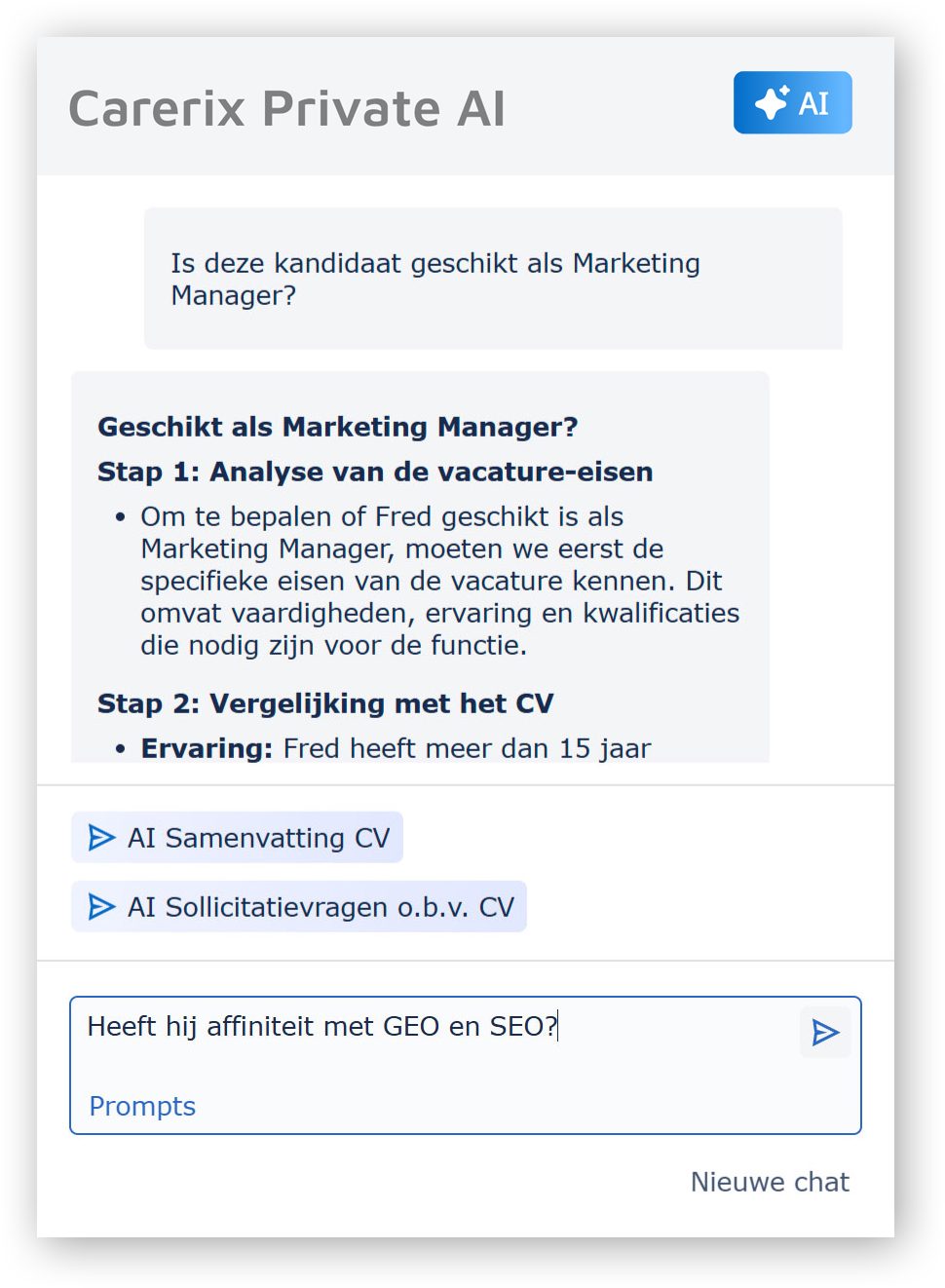 De AI Assistent werkt met alle gegevens die al in het systeem staan. Het kan de gegevens combineren tot nuttige outputs zoals gepersonaliseerde brieven, kandidaatsamenvattingen of overzichten van specifieke vaardigheden en ervaring.